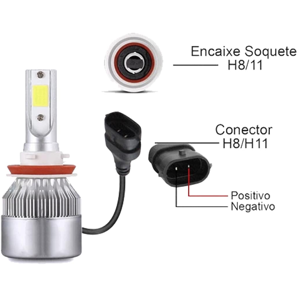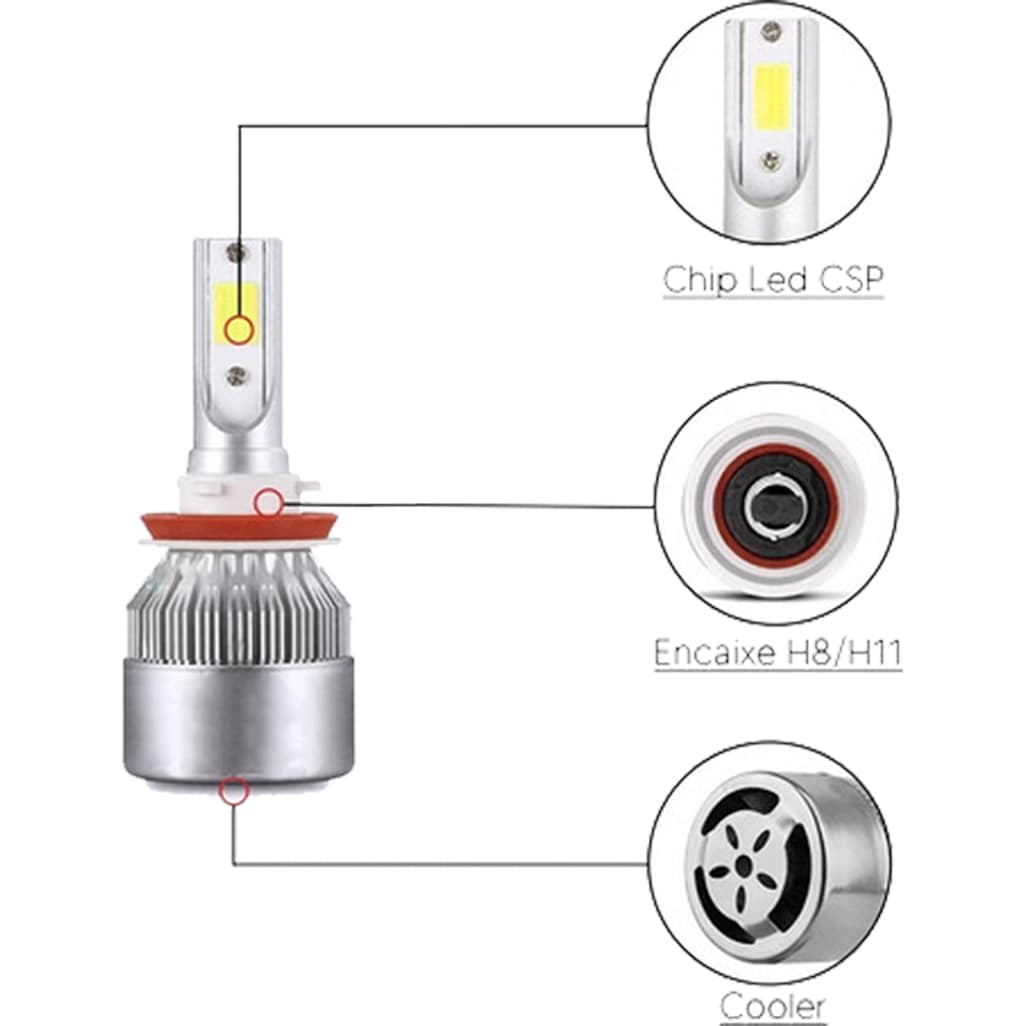 Especificação: H11 | 6.000 Lúmens | 12-24Volts | 40W | Possui Foco | Cooler Integrado | Dissipador Integrado | Sem Reator | IP65 – Prova D’água | Resistente à Poeira | Extremamente Branco